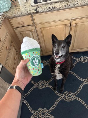 [This review was collected as part of a promotion.] Literally this is so stinking cute and my dog Maggie loves it! It has a great squeaker and it feels pretty durable for a dog toy. She hasn’t destroyed it yet, so that’s really saying something. It was a compatible size for a medium to large dog and just ridiculously cute! I love that it’s a play off of a Starbucks coffee.