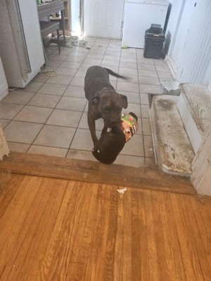 [This review was collected as part of a promotion.] Cute toy, but unfortunately not durable enough as my Cur/Rhodesian mix chewed the stuffing out of it within a matter of days. The crinkling sound and the squeaker got the attention of the cat and our mastiff.