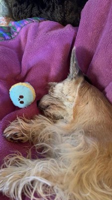 [This review was collected as part of a promotion.] These are the perfect size for my mini schnauzer. She loves little stuffies as her babies and quickly took off with one of these macaroons. Little Velcro soft box and comes with 2 macaroons that squeak.