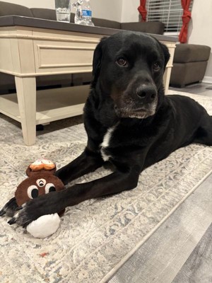 [This review was collected as part of a promotion.] Gave this to the fur nephew for Christmas and he couldn’t put it down. He was so excited! He’s a pretty big guy and the size is perfect! The squeak is his favorite. He has been playing with it for two days and it’s held up really well with zero tears so far.