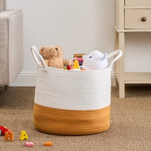 The round design features a generous capacity, perfect for storing laundry, blankets, toys, or other items. The neutral white and orange color scheme complements a variety of home decor styles, while the sturdy handles make it easy to carry and transport.