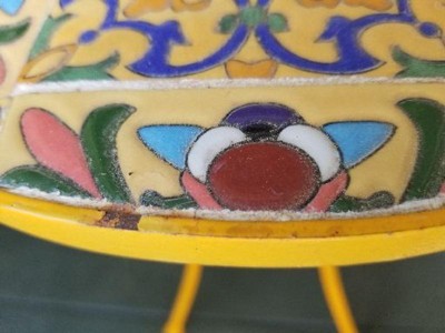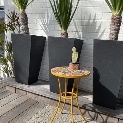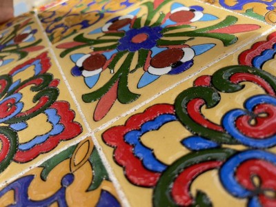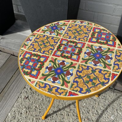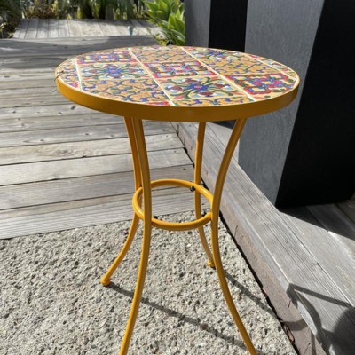 This end table is a great way to add a splash of sunlight to your patio. With a ceramic tile mosaic top and a yellow powder-coated iron frame, this table is its own ray of sunshine. Featuring bright flower based tile designs, this wonderful accent table is sure to brighten your day.