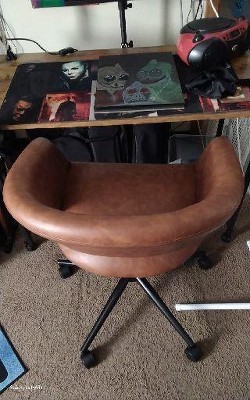 A: Hello Guest - Thank you for your interest in the Rolling Swivel Barrel Back Office Chair from Room Essentials. The Caramel color's seat material is PU leather and the Green color's is a corduroy. Happy Shopping! - Cynthia