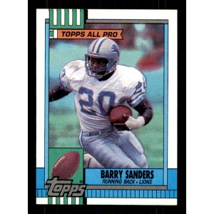 A collectible card featuring Barry Sanders from the 1990 Topps All-Pro series. It highlights one of the NFL's greatest running backs during his prime.