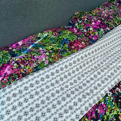 - THE BASEL DESIGN: One of our most popular sets, Basel is the freshness of a rich bouquet of flowers. The front is a bright floral garden design in black, fuchsia, purple, orange, blue and yellow on the front and the reverse is black and white geometric. The comforter is filled with soft, hypoallergenic 100% polyester.