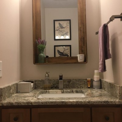 I had been looking for a bathroom mirror for a long time and finally found this one. Love the little shelf which seems somehow deeper than the measurement given! (Bird prints, hand towel, and foaming soap dispenser also from Target!).