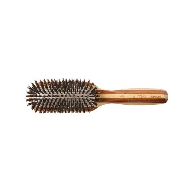 Longtime favorite, quality brand Bass. Hard to find firm natural boar bristles, in cushion bed, with ergonomic oval shape and wood handle, massages scalp/head muscles for health, including for eyes and hair. Exfoliating dead skin clogging the scalp hair follicles; removing dust/mites and falling hair; and dispersing scalp/hair oil througout hair, reduces need to harm hair by overwashing stripping acid pH mantle, blowdrying, and adding more styling chemicals. Okay that this one is smaller/lighter than my old one, as I wanted this one for backkup in my emergency go-bag.