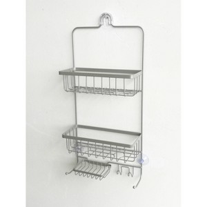 - Hanging shower caddy slips over shower head to save space