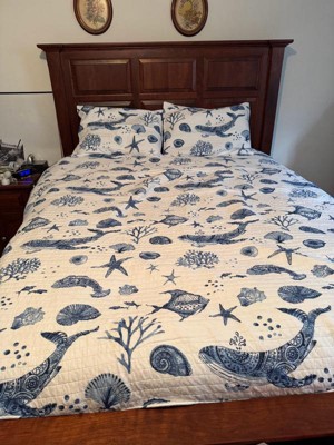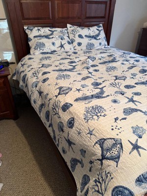 [This review was collected as part of a promotion.] Design & Style: This set features a beautiful coastal theme with blue sea turtles, shells, starfish, and coral on a crisp white background. The blue-and-white color palette feels calm, clean, and beachy—perfect for a coastal, nautical, or summer-inspired bedroom. The pattern is detailed and elegant without being too busy. Fabric & Feel: The fabric appears to be lightweight and soft, with a quilted texture that adds a cozy feel while still being breathable. It’s comfortable for year-round use, especially ideal for warmer climates or spring/summer seasons. Quality: Stitching looks neat and evenly spaced, giving it a durable, well-made appearance. The material seems easy to maintain and suitable for regular use. The branded ties suggest attention to presentation and quality. Comfort: Provides light-to-medium warmth—great if you prefer a comforter that isn’t too heavy. It layers well with blankets for cooler nights.