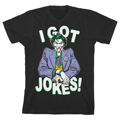 • GRAPHIC TEE: Joker appears on this tee in his green and purple suit. The Joker crosses his hands and waits with a wide grin. White text above and below the villain reads, "I got jokes!" Boys can show off their funny side with this graphic tee.