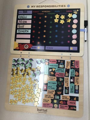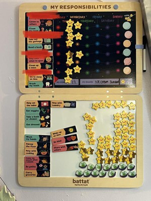 [This review was collected as part of a promotion.] The Battat Education magnetic responsibility chart is very neat. It has three different reward options one if they done it good one if they done it okay and one if they didn't do it at all or not a good job. It is a star, a star that is yellow and brown and a space alien with a sad face. It is a nice way to keep track if they done want they was asked and you can reward them with other stuff if they get all stars all week long.