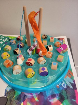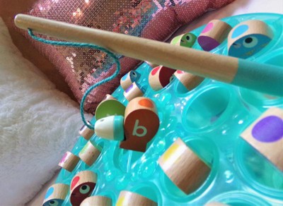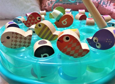 [This review was collected as part of a promotion.] I'm glad we found this fun new game to incorporate into our alphabet learning time. First of all, it doesn't feel flimsy like some children's games. It's very well-made and the pieces feel substantial. The game consists of a round, transparent blue plastic water base with color-coded holes to tuck the wooden fish into. The magnetic fish have bright patterns on one side and colors and letters when you flip them over. You also get two magnetized fishing poles, as well as a deck of alphabet cards with bonus words on the flip side. The game teaches young kids several skills at once. The fishing poles allow them to develop fine motor skills as they "fish" and manipulate the sea creatures out of their holes. They also learn color matching and the alphabet, graduating to learning simple words. It's so much fun that they won't even realize it's educational! Also, my grade school aged kids didn't mind playing it with the younger one because catching the fish was still fun for them- so that's a bonus.