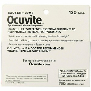 Bausch and Lomb's original Ocuvite Eye Vitamin and Mineral Supplement helps replenish essential nutrients to help protect the health of your eyes. With lutein as a strong source of nutrients, Ocuvite helps support macular health by helping filter harmul blue light. Ocuvite's formulation with 2mg Lutein and other key eye nutrients helps protect overall eye health, and is the #1 doctor recommended vitamin-mineral supplement that supports eye health and support. This eye supplement from Bausch + Lomb contains Lutein as well as other nutrients that are important to healthy eyes, including Vitamin A, Vitamin C, Vitamin E, Zinc, Selenium & Copper. Eye Nutrition for Today. Ocuvite eye vitamins focus on one thing - supporting your eye health. With gummies, chewables, formulas with the benefits of a daily multivitamin & eye vitamins for adults over 50, Ocuvite supports your eyes at all ages of adulthood. Bausch + Lomb carries a full line ocular supplements with vitamins, minerals and nutrients that promote eye health, including Ocuvite eye vitamins for general eye health and PreserVision for age-related eye health concerns.