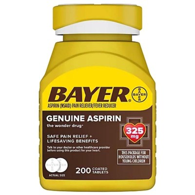 Genuine asprin. . . .BAYER pain reliever . . . . Fever reducer . . Safe pain relief plus lifesaving benefits according to the bottle. I like that the tablets are coated!