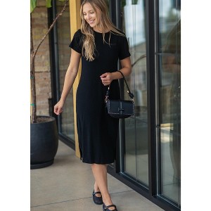 Slip into pure comfort with the casual Baylor Ribbed Tee Shirt dress! Its modest round neckline keeps coverage up on top, while the relaxed bottom and 2 side slits soften the silhouette. Crafted from a soft knit blend fabric for just enough stretch with a non clinging ribbed texture. Perfect for layering, add a sweater or denim jacket over it for all-season style!