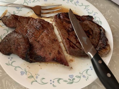 [This review was collected as part of a promotion.] Wow these steak knives are excellent quality, nice heavy duty quality knife that's extremely sharp for those nice big thick porterhouse steaks I love. This knife cuts right through no problem. Highly recommend this steak knife set it's one of the best i've ever owned,