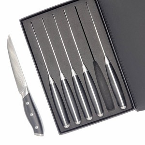 The ultimate knife for steak. A set of 6 premium quality, beautifullydesigned steak knives that are make to last for many years. High-quality stainless steel serrated blades. Full-tang, triple-riveted ABS handles. Full grip and perfect balance. The blades are made from an advanced 7cr17mov stainless steel, with a blade hardness of 51-55 HRC. They will stay sharp and resist stains and scratches through years of tough use. Elegant gift box suitable for long-term storage.