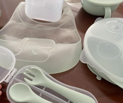 I bought this feeding utensil set to prepare for outings with my child, and I was pleasantly surprised when it arrived. Everything is made of soft silicone, so it feels gentle and flexible. The suction cups on the bottom of the dishes are very strong—once they stick to the table, they’re not easy for little hands to pull off. I really love that each item comes with its own storage case, which keeps everything clean and separate when we’re on the go. The small bowl with a straw is especially versatile—it works great for soup and can also be used as a snack container while traveling. The straw cup seals completely and doesn’t leak at all. The spoon and fork each have their own cases too, which is such a thoughtful touch. Overall, this set is practical, well-designed, and perfect for outings.
