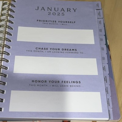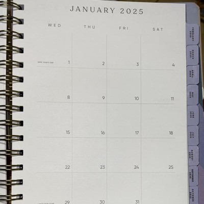 - Monthly Page — Our 12-month dated planner contains 12 monthly calendar view pages for 2025. This page view gives you the prior and upcoming month for easy reference along with additional blocks to write goals and keep track of to-dos.