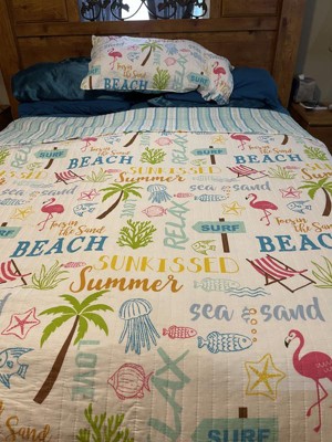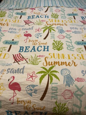 The Beach Days Reversible Twin Quilt Set by Homthreads is inspired by Summer days at the beach. Offered in shades of teal, blue, yellow, green, brown and pink, this design will immediately transform your bedroom. Made with the softest lightweight cotton, this reversible quilt features beach motifs, flamingos, palm trees and fun words on the one side, reversing to a teal blue and white stripe on the other. The Twin Quilt Set has a cotton rich filler (90% cotton, 7% rayon, 3% other fibers) and is machine washable and includes the quilt (68x86in.) and one standard pillow sham (26x20in.) Enjoy this for years to come!