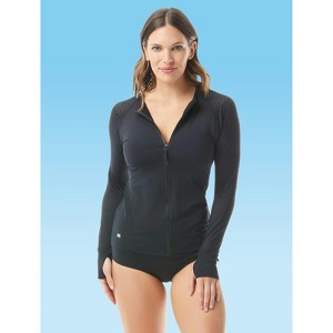 Stay active with the Beach House Sport Ava Zip Front Rash Guard. It has full-length sleeves with thumb holes, solid colors, and white trim. Wear it over your swim top for extra sun protection.