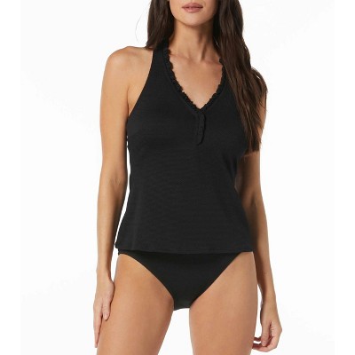 A slimming and flattering tankini top gets a playful ruffle trim neckline. A soft, textured, pique fabric elevates your swim style with a bold tropical print.