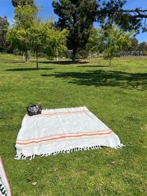 [This review was collected as part of a promotion.] Great blanket, super comfortable with simple design and thick material. Love how versatile it is and can be used at the beach, to sit on the grass, or as a blanket for those Spring and Summer nights outside. Great extra large size and can seat at least 4 adults comfortably. The sand comes off the blanket pretty easily after a few shakes. Haven’t had a chance to wash this just yet, but downside is that it has to be hung dry. Not sure on shrinkage or if the tassels will unravel if you were to dry it, but I’ll hang dry to be safe.