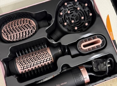 I own a lot of Beachwaver products The Beachwaver Blowout Brush in Midnight Rose is an innovative styling tool designed to deliver salon-quality blowouts at home. This brush combines the functionality of a round brush and a blow dryer, streamlining the styling process and making it accessible for users of all skill levels. The blowout brush features advanced ionic technology, which helps to reduce frizz and static, leaving your hair smooth, shiny, and healthy-looking. One of the key benefits of the Beachwaver Blowout Brush is its ability to create volume and body effortlessly. The brush head is designed to lift the roots while smoothing the hair shaft, resulting in a professional-looking blowout with minimal effort. The ergonomic handle and lightweight design make it comfortable to use, even during longer styling sessions. The Midnight Rose color adds a touch of elegance and sophistication, making it not just a tool, but a stylish accessory for your beauty routine. Additionally, the Beachwaver Blowout Brush offers multiple heat and speed settings, allowing users to customize their styling experience based on their hair type and desired results. The cool shot feature is particularly useful for setting styles and adding extra shine. The brush heats up quickly and maintains a consistent temperature, ensuring efficient and effective styling. Overall, the Beachwaver Blowout Brush in Midnight Rose is a high-quality, versatile tool that simplifies the blowout process and delivers impressive results. Its combination of advanced technology, user-friendly features, and stylish design makes it a valuable addition to any hair care routine. Whether you're looking to achieve a sleek, polished look or voluminous, bouncy waves, this blowout brush is up to the task.