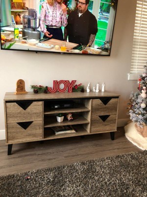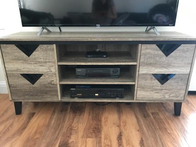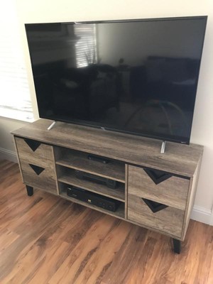 Looks amazing. Perfect size for our 55” TV. Handy bro-in-law put it together for us. Aprox. assembly time: 2.5 hours which includes brother hangout time. Great size drawers and love the symmetry of the stand. Great addition to a small living room.