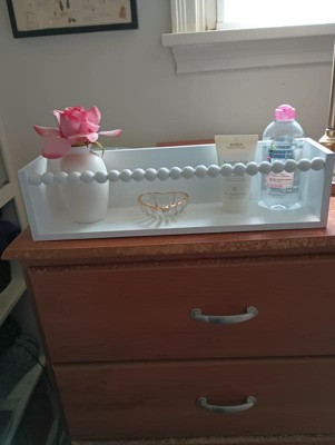 I am writing a review on this decorative wall shelf. I received these products for free from the Hey, Bullseye sampling. For my honest review of it. This wall shelf is super cute. I love the bead detail. It has built in hangers on the back. To hang it on the wall. I think this shelf is so cute. That you can also use it to hold things. Like on a dresser, on a table, and etc. I am using mine to hold stuff on my dresser. This is a really nice shelf. Could be used in any room in the house.