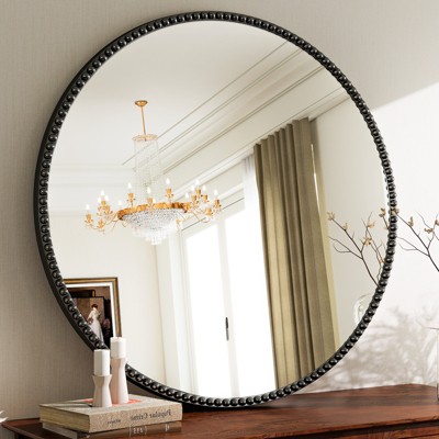 Reimagine your space with our Madison Park Signature Marlowe Beaded Round Wall Mirror. This round mirror features a stylized spherical iron frame finished with matte black foil, creating a bold and glamorous allure. The keyhole hook fixture on the back of the mirror allows for effortless hanging on your wall. Measuring 27x27in easily incorporate this mirror into any small space, bedroom, or entryway - for the perfect combination of modern glam and flair. Wipe clean with damp cloth and handle with care.