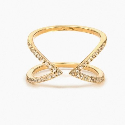 Claire ring is a truly artistic piece for minimalist lovers but even the bold and chunky jewelry wearers will love this one. The ring features two thin bands that sit poised in an open-mouthed fashion on the front and come together in a V-shape where the bands meet. The ring also features tiny stud detailing on the bands. - Gold plating over brass