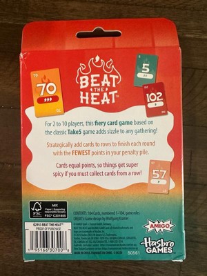 Get fired up for the Beat the Heat game! Designed for the whole family, this strategy card game for kids and adults is all about scoring low. The player with the fewest points wins. In each fast-paced round, players carefully choose number cards from their hands to play on one of 4 rows. But beware! Any player that plays the sixth card in a row will have to take the first 5 cards—and all the points that come with them. Ideal for family game nights and friendly gatherings, this easy-to-learn yet strategic card game is suitable for ages 8+. Family card games for adults and kids also make great travel games and go-to games for game night and family time. The Beat the Heat game is a fun gift for teens, adults, and kids who love party card games and family card games. Beat the Heat and Hasbro Games and all related trademarks and logos are trademarks of Hasbro, Inc. Hasbro Gaming and all related trademarks and logos are trademarks of Hasbro, Inc.