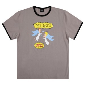 Step into the world of Beavis & Butt-Head with this pepper crew neck short sleeve ringer tee, boasting a bold contrast collar and sleeve hems. Featuring Butt-Head and Beavis in angelic attire under a humorous yellow text bubble proclaiming, "This Sucks," this graphic tee is a nod to the iconic duo's irreverent humor. Crafted from 100% cotton, it offers both comfort and style for any occasion. Easily maintain its vibrant design by machine washing it on cold with like colors and tumble drying on low heat.