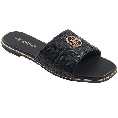 Step out in bold, effortless style with the bebe Women's Slingback Sandals. Designed with sleek double straps, a metallic bebe logo accent, and a secure back strap for a snug fit, these flat sandals bring designer flair to your everyday look. Lightweight and easy to wear, they’re perfect for casual days, travel, or styling up your favorite summer outfit. Fashion meets function in this modern must-have.