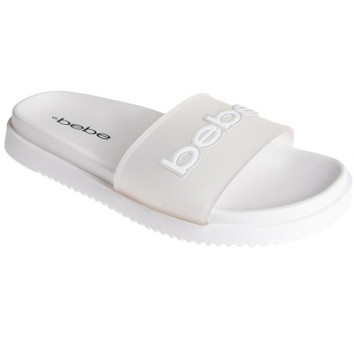 bebe Women's Strappy Flat Sandals – Slingback Dress Sandals with Rhinestone Detailing, White, 7