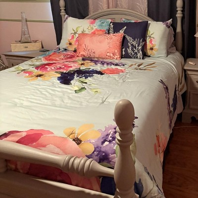• Comforter Front: Fit for a garden party, a lovely assortment of colorful flowers in pinks, purples and indigo blue sit atop a textured aqua background