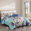 - Comforter Front: Bouquets of colorful flowers, in peach and royal blue tones on a lovely, soft turquoise background