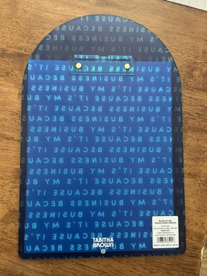 This stylish and functional Acrylic Clipboard from Tabitha Brown for Target is a practical addition to your stationery. Made of acrylic, this clipboard features a gold-tone clip that securely holds paper sheets for a smooth writing experience. Plus, it is designed in an arched shape and displays "Because it's My Business" text on a blue backdrop for a fun look.