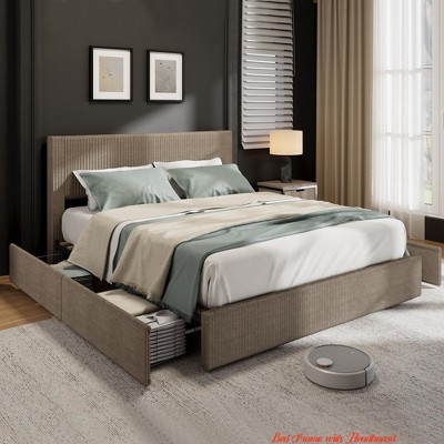 Corduroy Bed Frame with Headboard, Platform Upholstered Full/Queen/King Size Bed Frame with 4 Storage Drawers and Wooden Slats Support, No Box Spring Needed, Brown/Beige/Black.