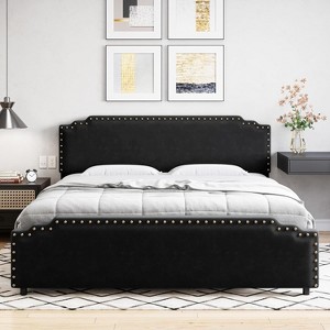 Experience restful nights with this sturdy bed frame featuring strong wooden slats and resilient rubberwood legs, supporting up to 1000 lbs without the need for a box spring. The plush velvet upholstered headboard with decorative nailhead accents adds modern sophistication to any bedroom. Constructed with a combination of wooden and steel slats, it ensures stability and eliminates squeaky noises for peaceful sleep. Assembly is easy with clear instructions and all necessary tools included, making setup quick and hassle-free.