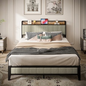 Full Size Bed Frame with Charging Station, Upholstered Headboard, Metal Platform, Grey