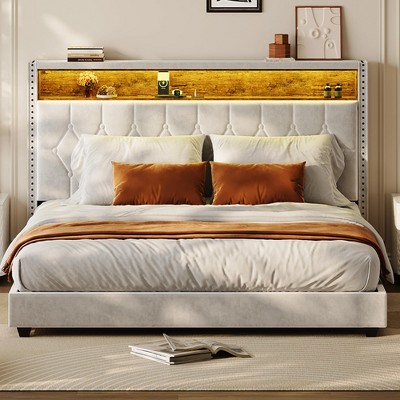- 【Charging & Storage Headboard】Built-in USB/Type-C ports for convenient device charging. 2-tier shelves keep books, clocks, or decor within reach, reducing clutter and boosting bedside convenience.