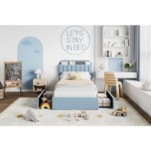 Bed Frame with Storage Headboard, Girls Bed Frame with 2 Drawers, Upholstered Platform Bed with Bookcase