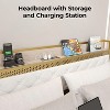 Experience ultimate convenience with a fully-featured headboard designed for modern life. It includes a built-in charging station with 2 AC outlets and 2 USB ports, keeping all your devices powered within arm's reach. The headboard also offers a practical 2-tier shelf, perfect for storing books, glasses, or phones, combining functionality with a sleek, upholstered design.