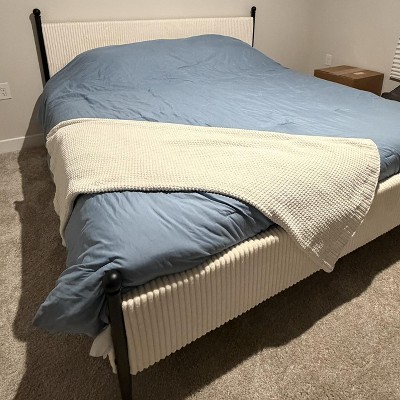 I just purchased this when it was on a crazy sale! Great price and great quality bed frame. Super easy to put together, took me 30 mins or less. Mostly just screwing in pieces with an Allen wrench! This looks great in our guest bedroom and I can’t wait to actually style it once we get settled in!