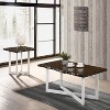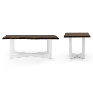 Chart a modern decor course that's inviting and eye-catching with this two-piece living room table set. The et features a rectangular coffee table and end table, each with a spacious live edge style tabletop in a rich dark oak wood finish. The generous tabletops rest on a contrasting white finish metal base with a crossed design that adds detail without being fussy.