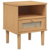 - This Rattan Look Bedside Cabinet is all about blending functionality with style, making it a fantastic pick for your bedroom. Made from solid pine wood and engineered wood, its trendy rattan look adds a unique touch that fits right in with different decor styles, from bohemian vibes to mid-century modern. Stylish Aesthetic: The rattan look surface makes this cabinet visually appealing, adding a trendy flare to any space. Its sleek, woven texture catches the eye and pairs beautifully with your other furniture.Robust Construction: Built from solid pine wood, this bedside cabinet is ready for consistent use. The engineered wood shelves keep it strong while looking good.Functional Design: With multiple compartments, this cabinet keeps your essentials organized. The easy-to-open drawer provides rapid access to your nighttime necessities.Perfect for Any Room: While made as a bedside cabinet, it also works great as an end table, fitting in nicely wherever you choose to use it ¨C whether for books, lamps, or decor.Compact Size: Measuring 15.7 in length, 13.8 in width, and 18.9 in height, it's designed to fit perfectly in snug areas without losing style, making it ideal for small spaces or cozy bedrooms. Color: BrownShape: RectangularMaterial: Solid Pine woodFinish: VarnishedIndoor/Outdoor: Indoor OnlyCover Included: NoRoom: BedroomDimensions: 13.8 x 15.7 x 18.9 in (W x L x H)Surface Height: 1.4 inLeg Height: 6.5 inWeight: 13.67 lbsDelivery Contains: Bedside cabinetAssembly Required: YesRecommended Number of People for Assembly: 2