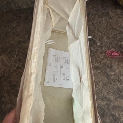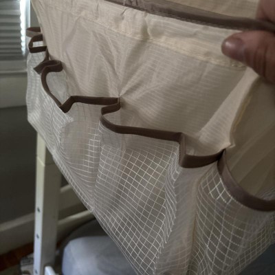 [This review was collected as part of a promotion.] Great concept, but unfortunately doesn’t hold up to the hype. The material is a “rain jacket” type, so easy to clean any spills. The pockets are roomy and abundant. The interior space is roomy. However, this didn’t work on any of the beds in our home. The way it hangs is super low and lopsided. And doesn’t work on a bed with drawers underneath. Might work great for a dorm bed though! I received an incentive to write this review.