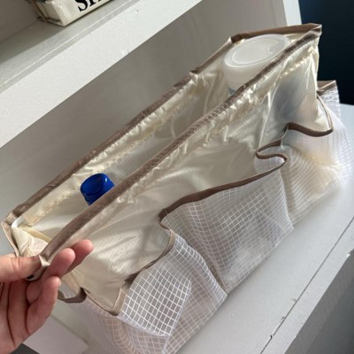 Keep your nighttime essentials close by and easy to reach with this Bedside Caddy from Brightroom™. This bedside caddy features a single rectangular compartment that comes in handy for stashing your phone, remote controls, reading glasses, books or more. Plus, it features all-around pockets to store small items such as jewelry, accessories, or more. Designed in a tan hue with a white grid-like print on the pockets, it's sure to add functional style to your bedroom decor.